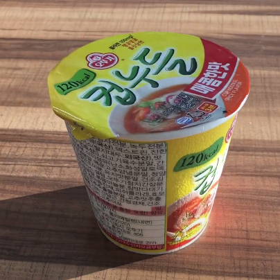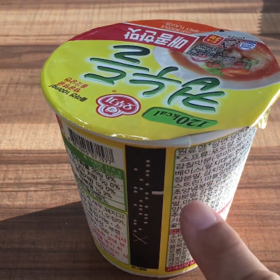 컵누들에 물은 붓고 잘 준비한 다음 영상을 담으려고 이렇게 저렇게 생각하고 있는데 컵을 자세히 보니 컵 옆면에 점자가 적혀있었습니다.
