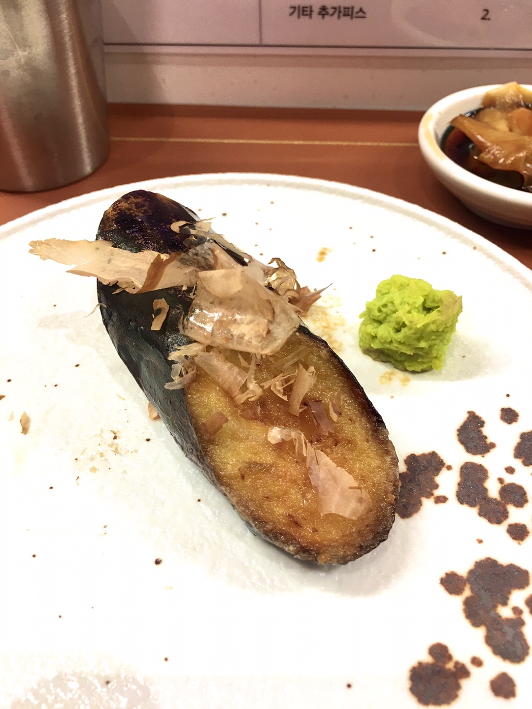 오늘 나온 초밥 중에 유일한 채소 초밥으로 가지를 잘 구워 가다랑어포를 살짝 올린 가지 초밥 역시 ^^