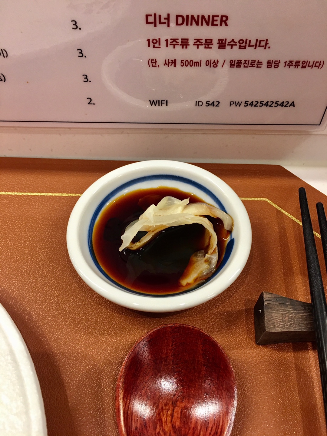 왼쪽부터 숙성광어, 연어, 한치구이 초밥으로 일본간장에 초생강을 담아 아주 살짝 시큼한 맛과 어우러지는 초밥으로 첫 스타트를 끊은 광어는 확실히 숙성해서 그런지 부드러운 식감의 초밥이었고 연어는 아는 맛이었지만 그래도 괜찮았습니다.