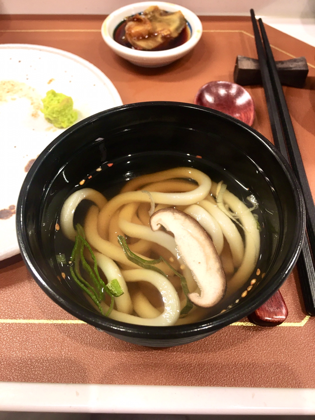 왼쪽부터 고등어 초밥, 그리고 식사로 나온 작은 그릇 우동입니다.