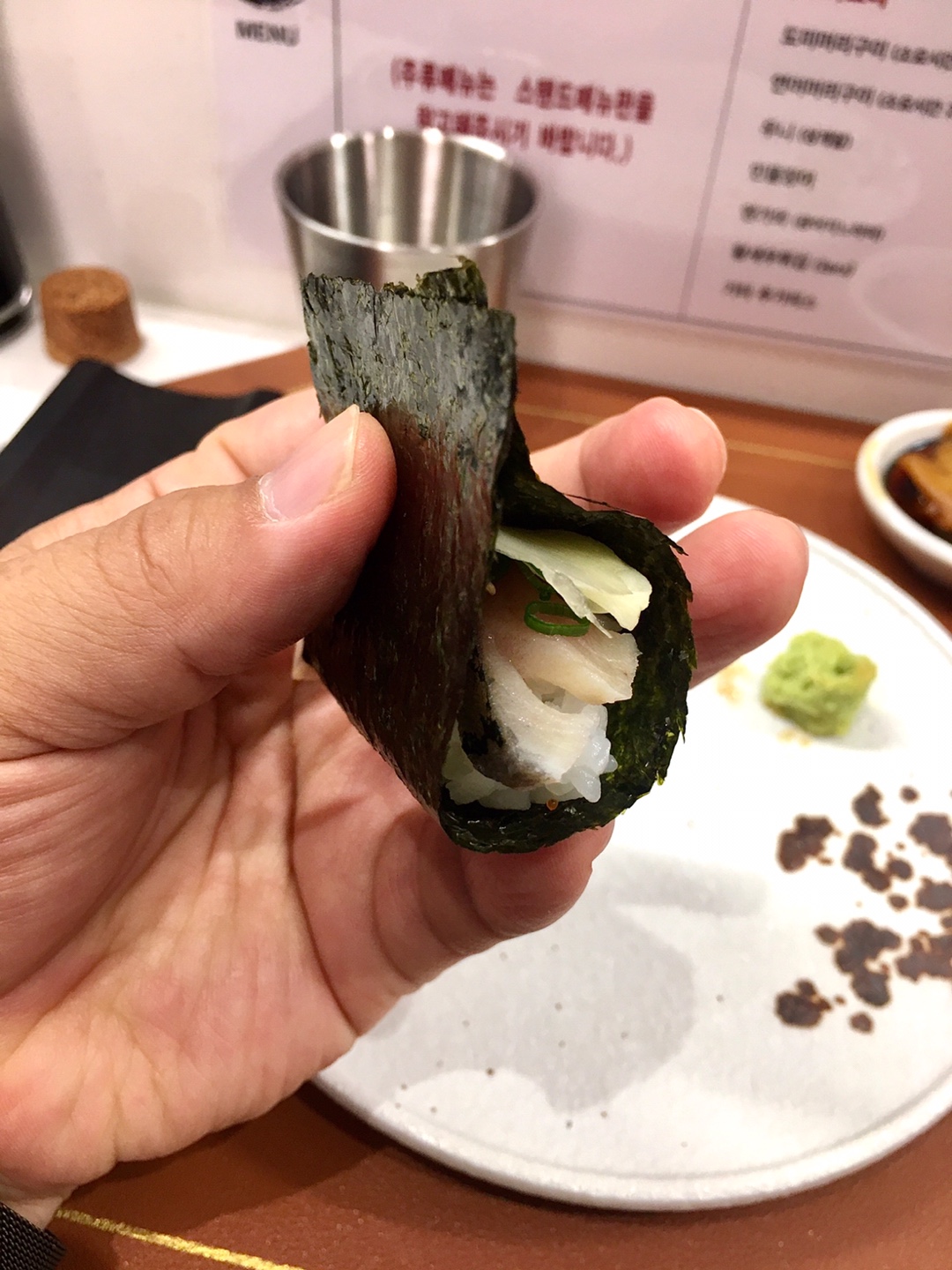 황새치도 한치처럼 살짝 겉을 구워 나온 것으로 참치 종류인 황새치는 회로 먹으면 기름이 많아서 김과 함께 먹어야 황새치의 과한 맛을 조절할 수 있는데 잘 손질된 칼집에 살짝 구워 그런지 목 넘김이 부드러워 좋았습니다.