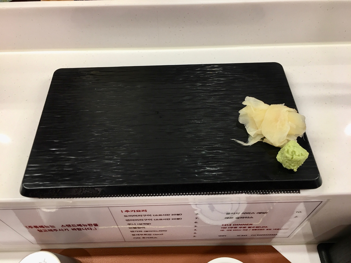 셰프가 초밥을 올려주는 검은색 접시와 그 위에 초생강, 고추냉이 그리고 초밥을 옮겨서 개인 취향에 맛게 먹을 수 있게 사용하는 접시와 도구 등이 아주 깔끔하게 꾸며져 있었습니다.