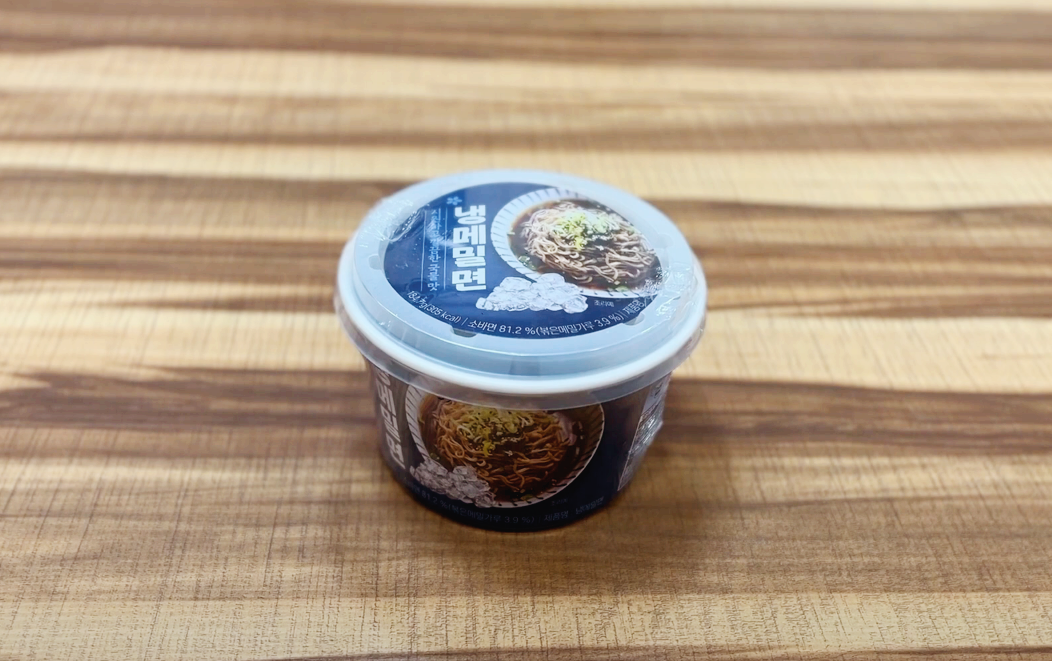 그렇게 도착한 사무실 1층 편의점에서 더운 열기와 비로 인한 습도 100% 를 해소하기 위해 고른 아침 간식! '냉메밀면'입니다.