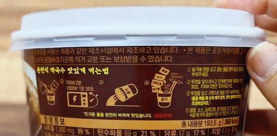막국수의 용기에 기록된 조리법을 보면 전자레인지가 표시되어 있습니다.