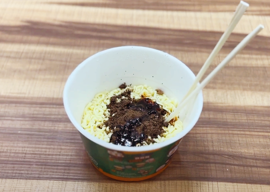 이렇게 볶음면, 비빔면 같은 류의 사발면은 제가 이전에도 말씀 드렸던 것처럼 면을 불리고 난 후 물을 버릴 때 다 따라내시면 안 됩니다.