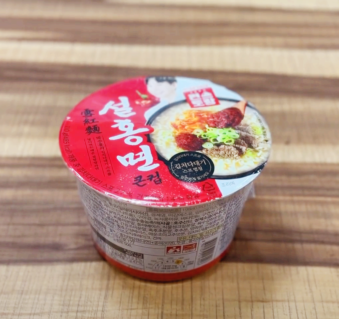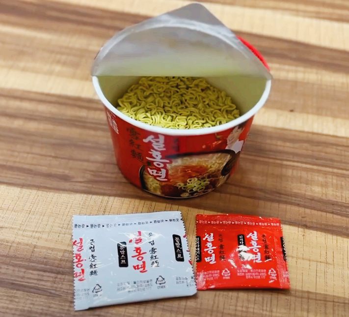 면과 분말스프를 넣고 뜨거운 물을 표시선까지 그리고 4분 뚜껑을 덮고 면을 익히는 방법인데, 이 설홍면의 면은 4분으로는 회사 정수기 뜨거운 물로는 어려움이 있어 적어도 4분 30초는 넘겨야 제대로 익은 면을 먹을 수 있습니다.